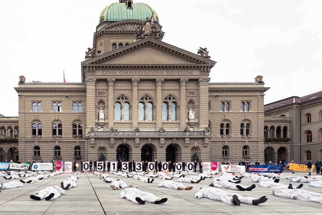 Un happening impressionnant et inédit a eu lieu devant le Palais fédéral ce samedi. Un compteur géant affichait le nombre d'animaux tués durant le temps de l'action, au pied duquel se trouvait plus d'une centaine de manifestant·e·s couché·e·s à même le sol, symbolisant ces victimes.